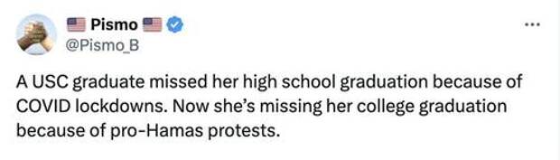 Here, a USC senior who was robbed of a high school graduation by the COVID Panic reacts to USC cancelling her college commencement because of an anti-Israel valedictorian and fear of protests…