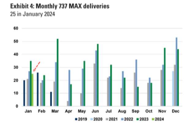 The analysts, led by Noah Poponak and Anthony Valentini, continued: "Deliveries slowed in January, in part due to seasonality and in part from Boeing slowing down the system to renew the focus on product quality."
