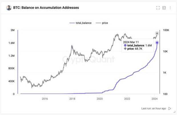 Ki showed an ongoing broad uptrend in BTC held by so-called “accumulation addresses” — wallets with only inbound transactions — with this still needing to double before the “crisis” sets in.