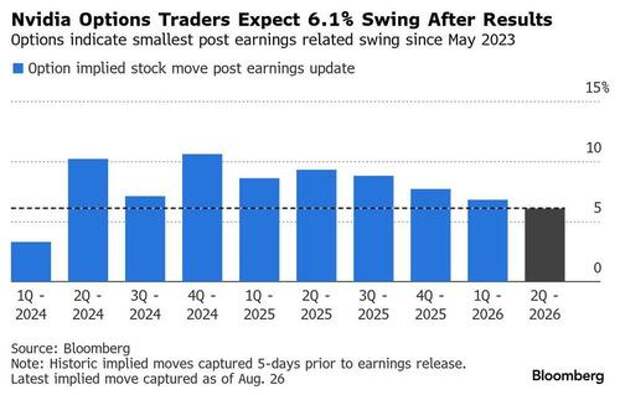 There’s been plenty to rattle markets in recent days, including French political turmoil and the Trump administration’s attacks on the Fed, as well as fresh tariff threats. But investors are now focusing on Nvidia’s earnings, due after the bell (our full preview is here). The chipmaking giant is expected to provide clues on the sustainability of massive AI spending, and how the US-China rivalry is limiting growth. Options currently imply a 6.1% swing in the stock, which would represent a move of roughly $270 billion in either direction in market value, larger than about 95% of the S&P 500 companies.