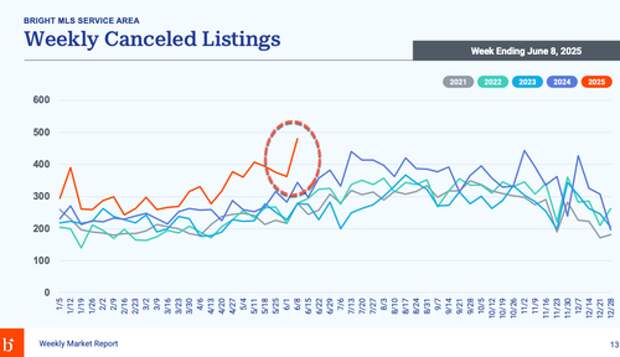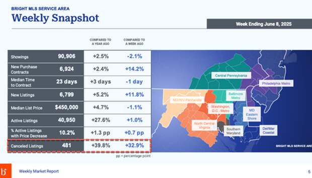 According to the latest data from Bright MLS, the leading Multiple Listing Service firm in the Mid-Atlantic area, 481 listings were canceled during the week ending June 8—the highest weekly total in five years. That figure represents a 39.8% increase from the same period last year and is up 32.9% from the previous week.