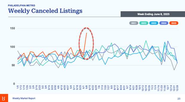 "Canceled listings see a five-year record high. There were 481 canceled listings in the service area for the week, which is a 39.8% surge over last year and is up 32.9% from last week. Canceled listings were most common in the Philadelphia metro area, where canceled listings were up 60.5% compared to the same week in 2024," MLS wrote in the weekly report.