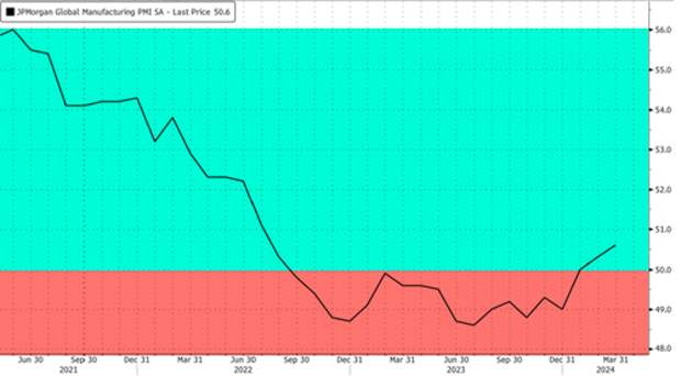 Meanwhile, the JPM Global MFG PMI index bottomed for the past year and recently moved into expansion territory.