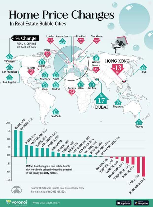 On the flip side, bubble markets like Dubai, Miami, and Tokyo have seen sustained price increases driven by population growth and demand in the luxury sector.This graphic, via Visual Capitalist's Dorothy Neufeld, shows the annual change in real home prices across housing bubble cities, based on data from UBS’ Global Real Estate Bubble Index 2024.