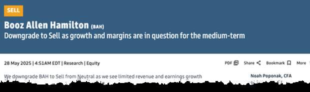 Downgrade Rationale: Booz Allen is downgraded from Neutral to Sell due to concerns about limited revenue growth, margin compression, and valuation risk over the medium term.