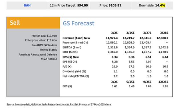 Valuation Risk: While Booz Allen trades at 17x CY26E P/E and 12x EBITDA—near historical averages—those multiples are at risk if earnings stay flat. GS analysts sees 14% downside to their revised $94 price target.