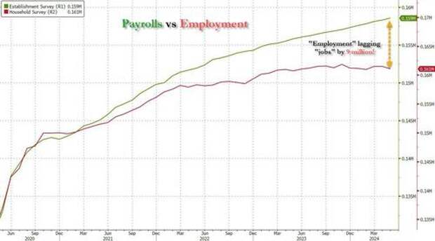 And that's how easy it is to flip what have been "strong" job reports from the past year - at least according to the Biden admin - to weak ones. We, of course, have discussed all this as well, most recently here "Inside The Most Ridiculous Jobs Report In Years" where we specifically highlighted the staggering divergence between the Establishment (i.e., Payrolls) and Household (i.e., Employment) surveys.
