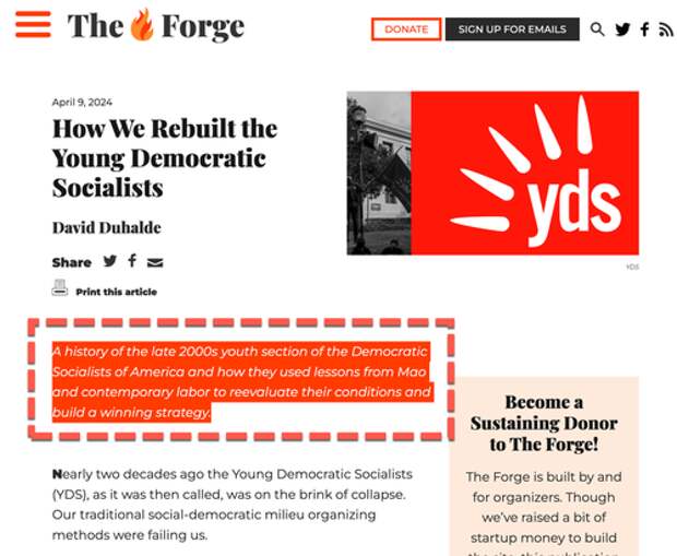 In 2024, Duhalde wrote, "A history of the late 2000s youth section of the Democratic Socialists of America and how they used lessons from Mao and contemporary labor to reevaluate their conditions and build a winning strategy."