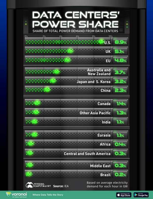 As we can see, America’s data center demand leads globally, at 8.9% of total power consumption.