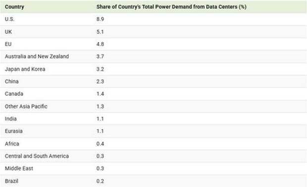 By comparison, data centers comprise 4.8% of the total power share in the European Union and 2.3% in China.