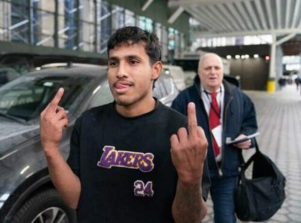 Following their release, a smirking Johan Boada, 22, could be seen giving a double middle finger to media covering the situation.