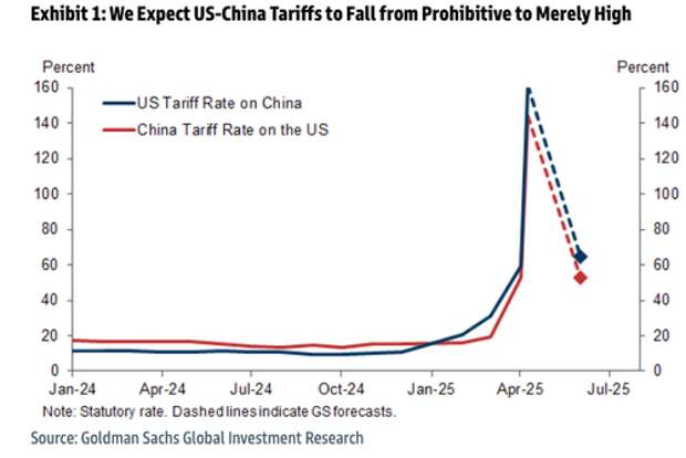 Earlier this week, Goldman chief economist Jan Hatzius told clients, "The mood music with China has improved, and we expect the U.S. tariff rate on China to drop from around 160% to around 60% relatively soon. (China is likely to reduce tariffs on the U.S. by a similar amount.)"