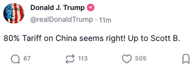 President Trump posted on Truth Social, "80% Tariff on China seems right!" while noting that the final decision rests with U.S. Treasury Secretary Scott Bessent.