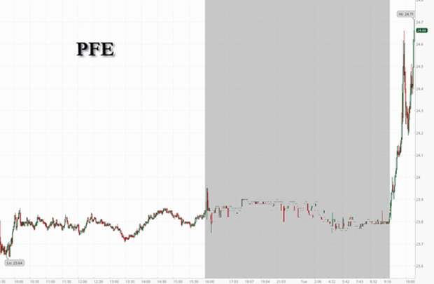 Shares of pharmaceutical giant Pfizer sprinted higher in early trade Tuesday after reports that later today, President Trump and CEO Albert Bourla, will announce that the company will sell drugs at lower prices to the US Medicaid insurance program as part of a deal to advance the Trump administration's "most favored nations" agenda.