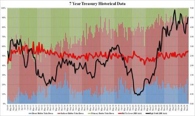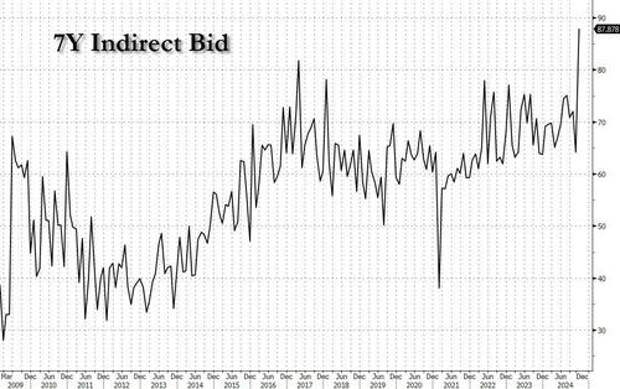 Overall, it is somewhat fitting that in this upside down market, where "investors" are dumping value energy names trading at single digit PEs to buy megashoter, garbage "AI story" stonks which will never not survive more than a year or two, let alone make a profit, that the final auction of the year would also be the best 7Y auction on record.