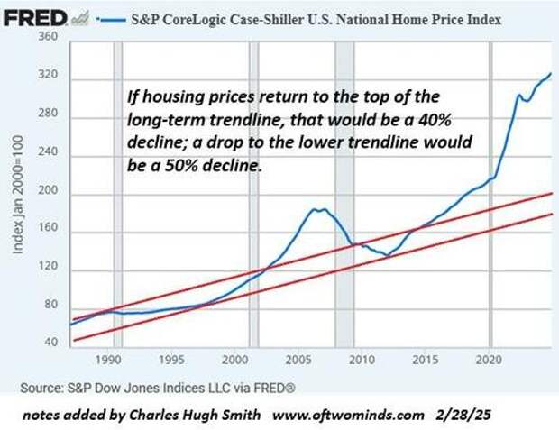 Here's the National Case Shiller Housing Index. I've added long-term trendlines to clarify the two housing bubbles inflated by rampant financialization. A return to the upper trendline would require a 40% drop in current valuations, and a return to the lower trendline would require a 50% decline.