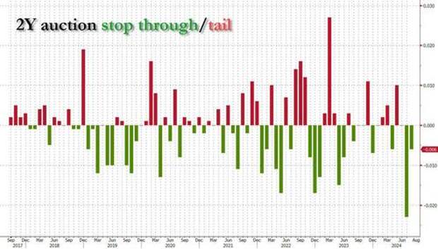 After a sharp reversal in yields, which in August tumbled to a fresh 2024 low, some traders were eyeing today's 2Y auction nervously to see if the move higher in yields would lead to some indigestion. In the end, it turned out there was no reason to be worried because moments ago the Treasury sold $69BN in paper to stellar market demand.