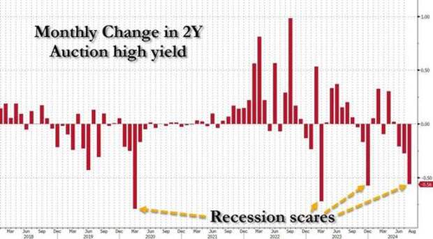 The auction stopped at a high yield of 3.874%, the lowest since August 2022 and down sharply from the 4.434% last month, a 56bps drop which was the biggest since the December recession scare (when we saw a 57bps drop), which in turn was the biggest since the March 2023 bank crisis. In short: any time you have a 50bps+ drop in sequential 2Y bond yields, you get a powerful recession scare. And yet, aside from March 2020 when the entire world shut down, the past two such recession scares ended up being a false start. We'll see if this latest one is the same.