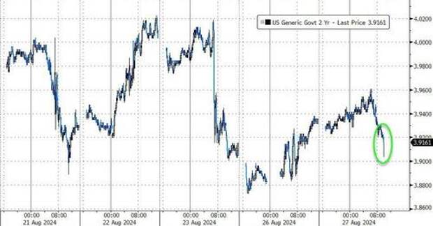 Overall, this was a solid if not stellar 2Y auction, and one which helped push 10Y yields lower, toward 3.83% after rising as high as 3.86% earlier in the session. Still, with the Fed now on pace to cut rates by 25bps no matter what, the real catalyst will be the August payrolls report next week while tomorrow's NVDA earnings may also have some impact on where the US rates complex will trade.