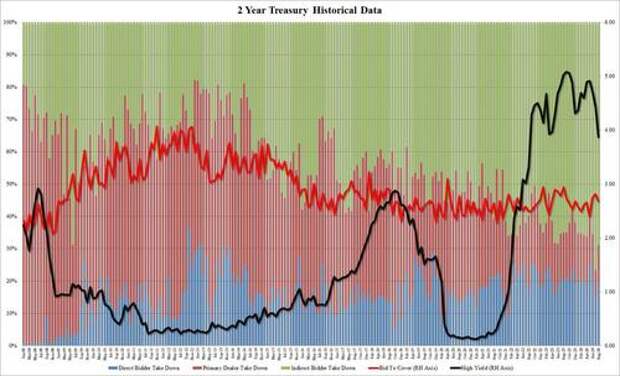 The internals were also on the meh side, with Indirects awarded 69.0%, down from 76.6% but above the recent average of 66.2%, and with Directs taking down 19.1%, the most since June, Dealers were left holding 11.9%, up from the record low 9.0% last month but above the recent average of 13.7%.