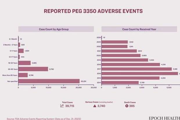According to a search by The Epoch Times of the FDA’s Adverse Events Reporting System, around 39,715 adverse reactions to PEG 3350 have been logged, including 2,607 cases involving children under 18. Experts caution that this may be the tip of the iceberg, suggesting widespread underreporting.
