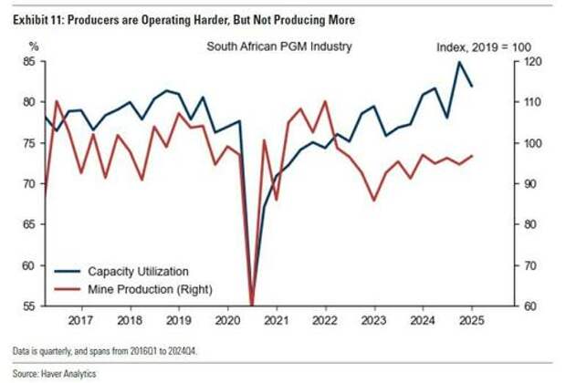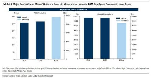 Here Goldman admits that PGM production cannot be easily increased due to capacity constraints, which is bullish for the price; alternatively, significant curtailments are also rare due to a high proportion of fixed costs inherent in these operations, particularly energy and labor. The heavily unionized nature of South Africa’s mining sector makes layoffs "politically sensitive" and doing so could increase the risk of strikes, social unrest and reputational damage. These socialist factors support a strategy in which mines operate at a high capacity utilization without materially increasing output; in other words just churning. Lower capex guidance - similar to the US shale patch - suggests producers are focused on extracting more from existing assets
