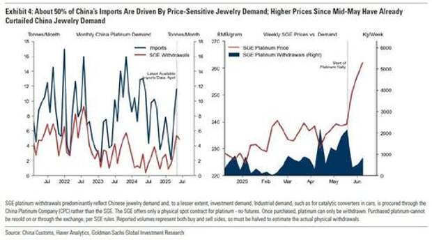 Goldman believes that this strategic buying has likely contributed to platinum’s range-bound trading over the past decade. Nearly 50% of China’s imports are driven by price-sensitive jewelry and investment demand. For instance, lower prices post-the ‘Liberation Day’ US tariff announcement contributed to higher platinum withdrawals from the Shanghai Gold Exchange (SGE), a proxy for Chinese jewelry and, to a lesser extent, investment demand, in April and consequently high Chinese platinum imports that month. But - the bank argues - the rally that started in mid-May appears to have already curtailed Chinese jewelry (and investment) demand for platinum. Which however is irrelevant if speculators have enough firepower to keep pushing the ascent higher, in which case Chinese jewelers will eventually be forced to chase the price again, only this time much higher.