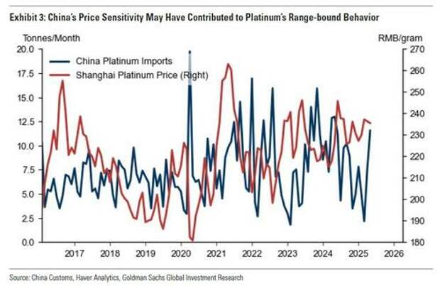 Chinese buying, which corresponds to about 60% of new annual platinum production, appears highly price sensitive, with increased buying when prices are low but reduced buying when prices are high.