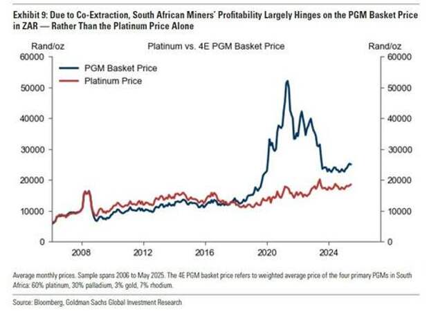 Platinum production is primarily a byproduct of other metals, such as copper, and is co-mined with other Platinum Group Metals (PGMs) such as palladium and rhodium. Consequently, the PGM basket price (denominated in ZAR) and revenue derived from associated metals — rather than just the platinum price — heavily influence the overall profitability of these mining operations. Periods of high prices for byproduct metals, such as the near-record chrome prices in 2024, can provide financial relief and offset downward profit pressure from lower platinum prices