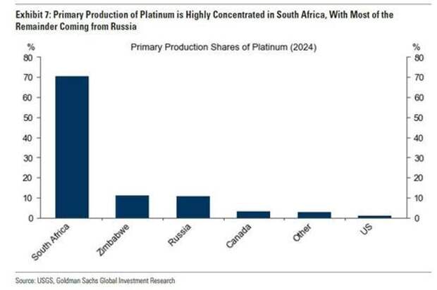 In an attempt to re-engage at the fundamental level, Goldman expects stable-to-moderately higher global platinum supply... unless South African power constraints re-emerge, which they will. Platinum production is highly geographically concentrated, with South Africa accounting for 70% of primary platinum production, with most of the remainder coming from Russia.