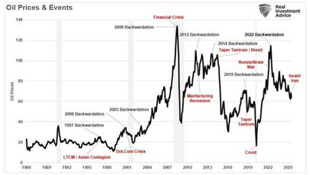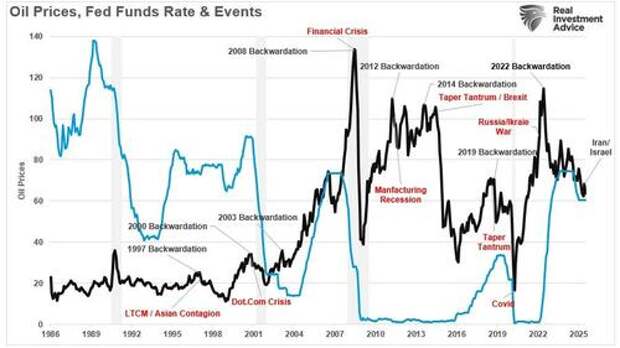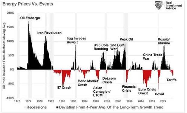 Since the oil industry is manufacturing and production-intensive, falling energy prices impact other economically important facets of manufacturing, employment, and capital expenditures. The chart below shows oil prices and events relative to the deviation from the 4-year average energy price. While geopolitical events spike energy prices, as is 2022, those spikes result in economic downturns, reducing demand, thereby lowering energy prices.