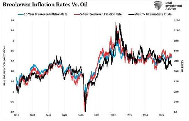Oil prices reflect overall economic activity, given their vast contribution to everything consumed. With liquidity reversing, economic demand is weakening as the cost of living outpaces real wages. As such, the correlation between declining energy price, future economic growth, and inflation breakevens should be unsurprising.