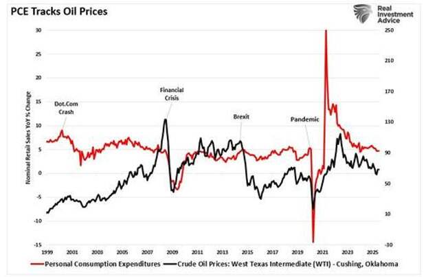 As noted above, global central banks have been cutting interest rates at the fastest pace since the pandemic, as many of those countries teeter on the edge of recession. However, the Federal Reserve remained steadfast until recently that its concern was a resurgence of inflation due to tariffs. But, as noted above, energy prices warned that inflation is not a concern for the U.S., and the Fed may be behind the curve in cutting rates.