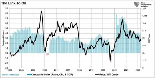 Since energy prices feed into virtually every aspect of our lives, from our food to the products and services we buy, we can expand our view of oil as an economic indicator. Therefore, the demand side of the equation is a tell-tale sign of economic strength or weakness. The chart below uses an economic composite of GDP, interest rates, and inflation compared to oil prices. It would be unsurprising that there is a decent correlation between the two.