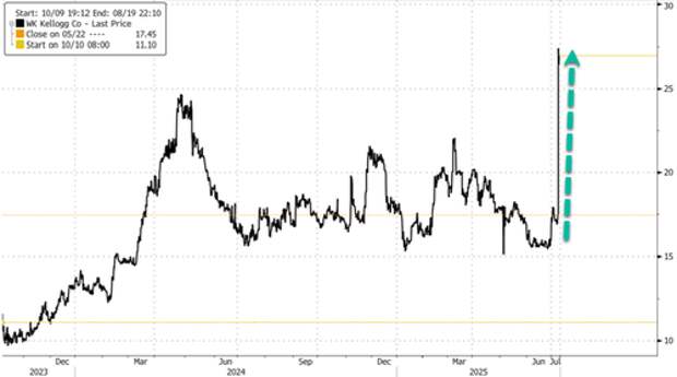 WK Kellogg shares surged 57% in premarket trading on reports of the deal. The cereal division has struggled since its spin-off from Kellogg Company, facing slumping demand due to rising competition from private-label store brands.