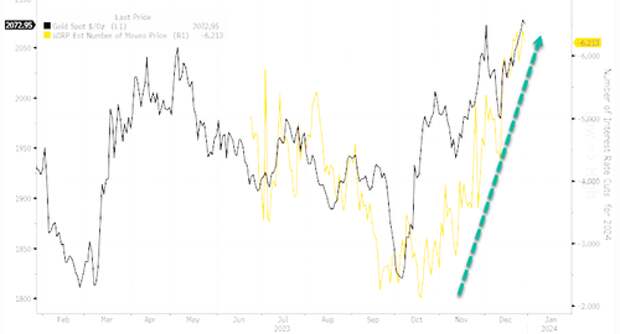 Costco's and Walmart's gold rush comes as gold prices have soared 14% since early October to a new record high of $2,088 this week. Gold's strength has been underpinned by traders' aggressive pricing of Federal Reserve rate cuts.