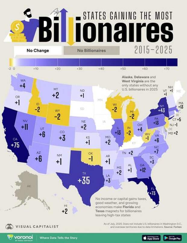 While California leads by overall billionaire gains (+75), two southern states are in the top five.