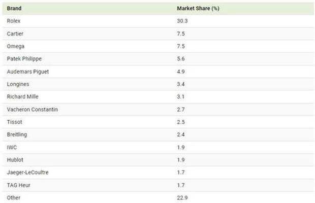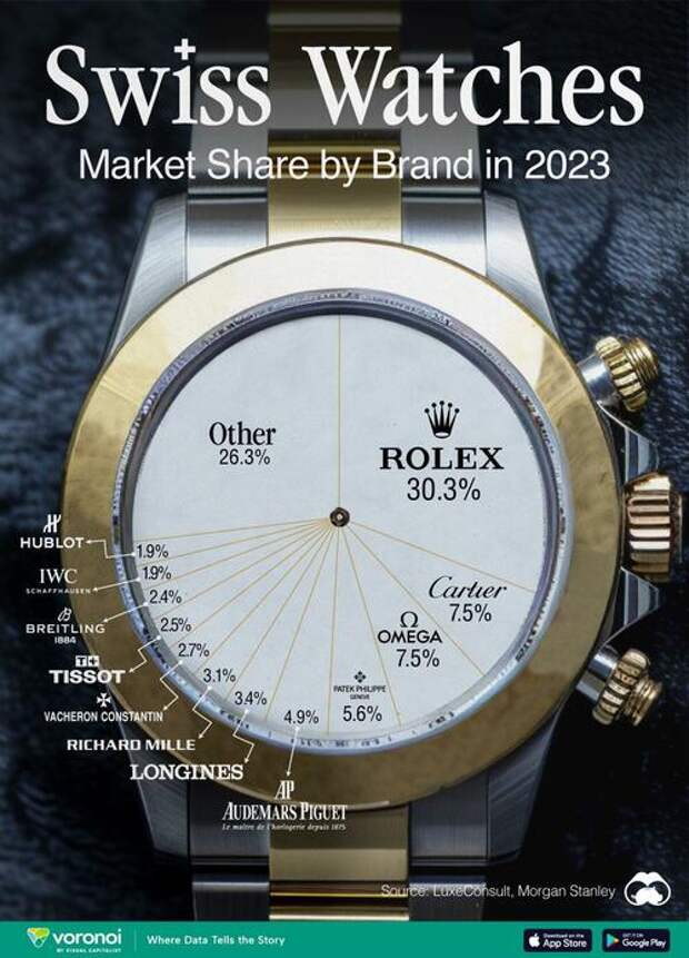 2 billion) for the first time in 2023, significantly outpacing rivals like Cartier CHF 3.1 billion ($3.5 billion) and Omega CHF 2.6 billion ($2.9 billion).Additionally, Rolex has strengthened its dominant position in the market, capturing a remarkable 30.3% retail market share.