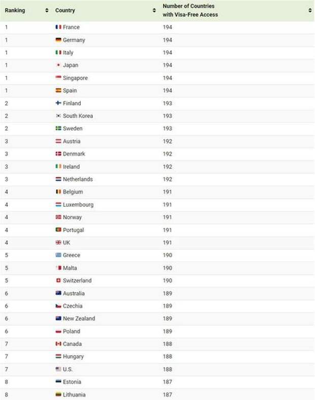 The world’s top passport is shared in a six-way tie, with visa-free access to 194 countries.