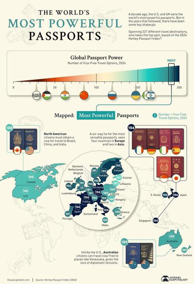 This graphic, via Visual Capitalist's Niccolo Conte, shows the most powerful passports in 2024, with data from the annual Henley & Partners Passport Index.