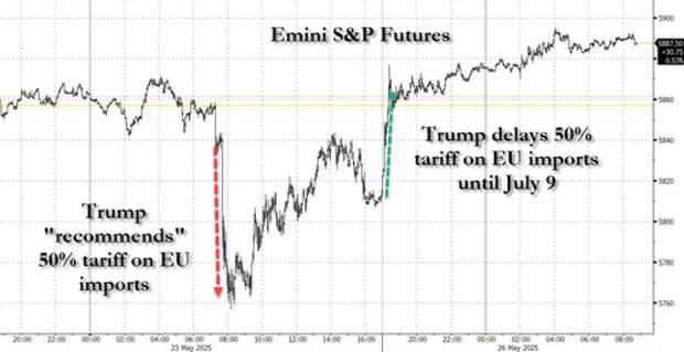 US equity futures surged and European stocks climbed after President Donald Trump extended a deadline on aggressive euro area tariffs, reinforcing the pattern of leaving markets guessing and flip-flopping by making trade threats before backtracking, all in keeping with the gamebook established during the Trump 1.