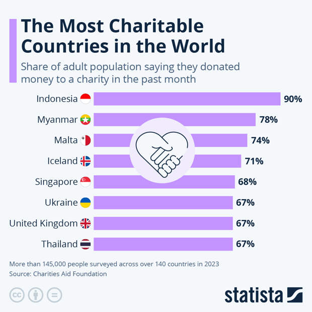 As Statista's Anna Fleck shows in the following chart, looking at data specifically on financial donations, 90 percent of respondents in Indonesia made this kind of contribution in the month prior to the survey. Myanmar, Malta, Iceland and Singapore round off the top five, as the next most giving countries worldwide.