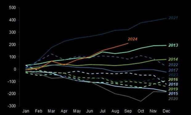 Notably, the amount of money flowing into assets has been remarkable since 2014. Despite many “concerns,” 2024 is on track to be the second-strongest year of monetary inflows since 2021. That statistic is amazing when considering the government was flooding the system with trillions in monetary and fiscal stimulus then versus contracting it currently.