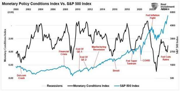 We have no idea what will eventually cause a shift in liquidity as the Federal Reserve and global central banks move back into easing mode. (The monetary conditions index combines interest rates, the dollar, and inflation. It is inverted to correspond to rising asset prices.)
