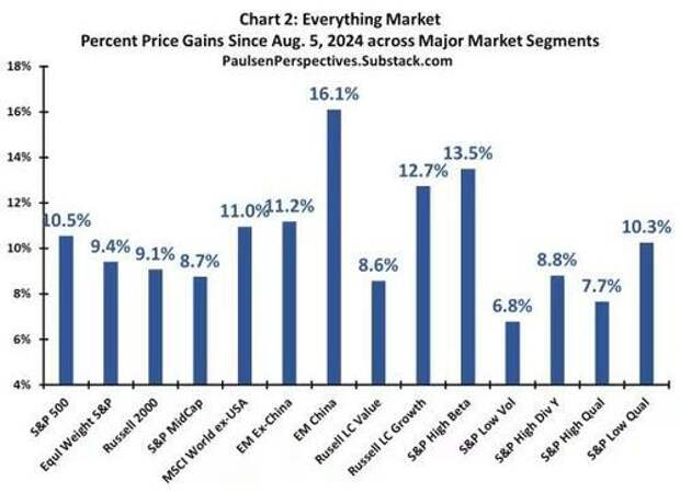A recent Marketwatch interview with the always bullish Jim Paulson got his reasoning for the rally.“It is this cocktail of ‘full support’ at the front end of a bull market which commonly has created an ‘Everything Market’ during the early part of a new bull. That is, for a period, almost everything simultaneously rises – value, growth, small, large, defensive, and cyclical stocks – and usually by a lot.