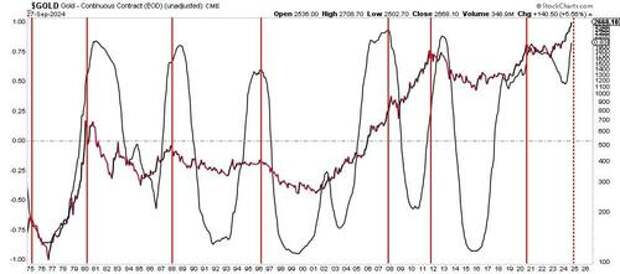 As such, gold is no longer a “risk-off ” asset with a negative correlation to equities but is now a risk-on asset, just like equities. The 4-year correlation to the S&P 500 is near previous peaks, with subsequent performance.