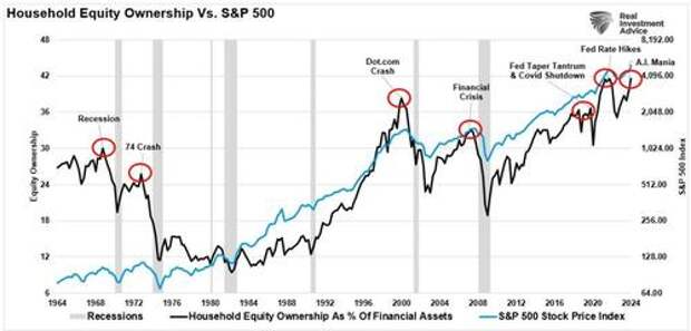 Yet, despite these essential fundamental factors, retail investors are again throwing caution to the wind. As shown, household equity ownership has reverted to near-record levels. Historically, such exuberance has been the mark of more important market cycle peaks.