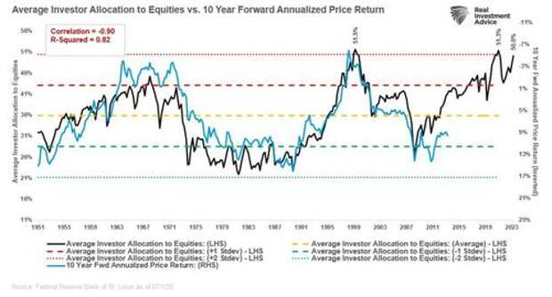 The 10-year forward returns are inverted on the right scale. Such suggests that future returns will revert toward zero over the next decade from current levels of household equity allocations by investors.
