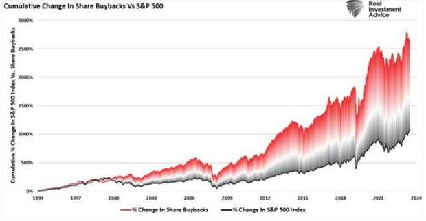At the same time, corporations have engaged in massive share buyback programs, which have elevated prices and reported earnings per share by lowering the number of shares outstanding.
