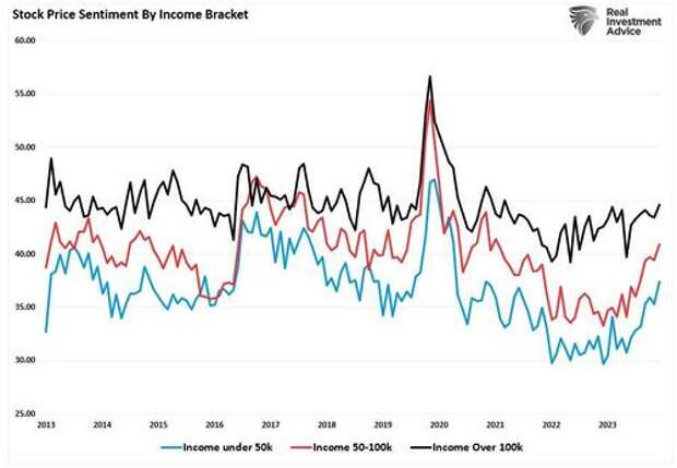 However, consumer survey data shows rising stock market prices lifted confidence across age and income brackets. That should be unsurprising given the daily drumbeat of social and mainstream media highlights of the current bullish market.